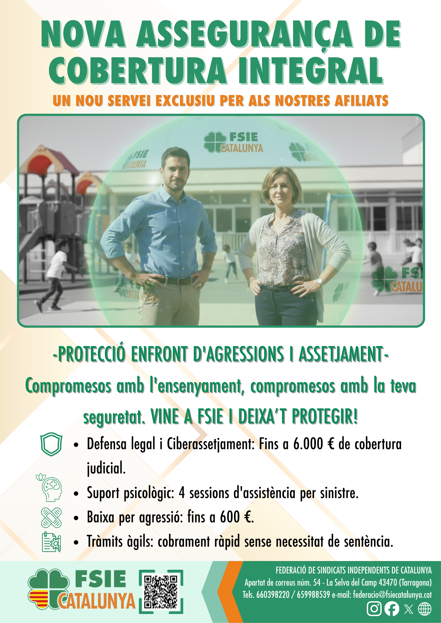 A FSIE cuidem dels qui cuiden. Per això, us oferim el nostre Servei de Protecció Integral contra l’assetjament, pensat perquè els nostres afiliats puguin desenvolupar la seva tasca amb seguretat, tranquil·litat i suport real.   Aquest servei ofereix acompanyament proper i especialitzat davant situacions d’assetjament en l’àmbit laboral o digital, posant la persona al centre.   Atenció directa i suport professional Els afiliats compten amb una línia de suport telefònic per a orientació i ajuda immediata: 📞 910 001 744 El servei inclou:   ⚖️...